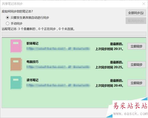 6、點擊查看同步狀態,可以根據自己的需求選擇只要發生更改就自動進行同步或手動同步。如果更新了筆記而同步未完成,也可以選擇全部同步或立即同步。