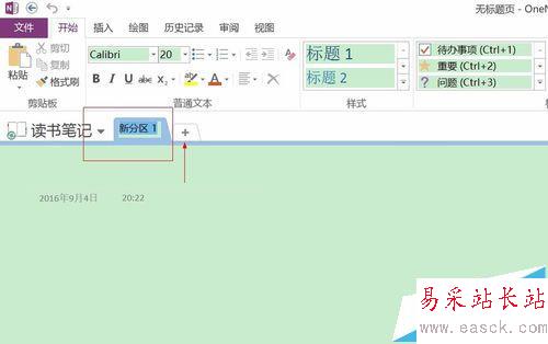 2、創建好筆記本后,打開該筆記本,此時筆記本中有一默認的分區,雙擊可以更改分區名稱,點擊該分區旁邊的加號可以新建分區。