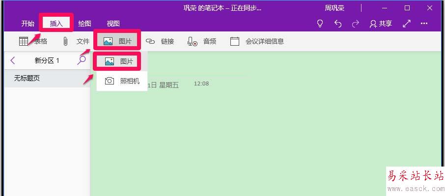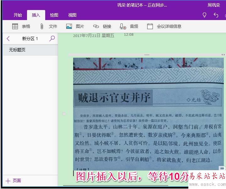 3、選取我們需要轉(zhuǎn)換文字的圖片,插入到筆記本中,等待10分鐘左右(正在同步);