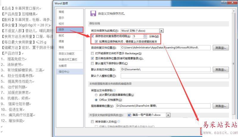 3、點擊進去以后會出現“Word選項”,在菜單欄上找到“保存”菜單。然后把“保存自動恢復信息時間間隔__分鐘”的選項勾上,默認設定的時間是10分鐘,我們可以將自動保存的間隔縮短一點,調成5分鐘左右,甚至你可以調得更短時間,根據需要來就好了。最后點擊確定保存。