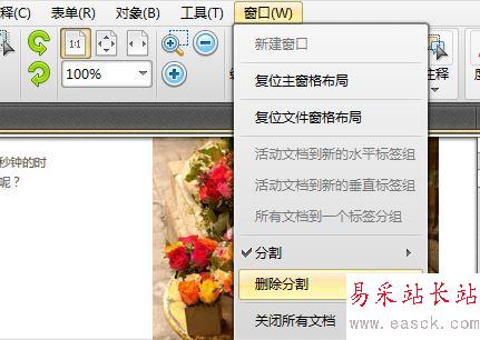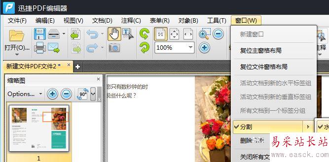5、鼠標點擊PDF編輯器菜單欄中的窗口菜單,在窗口下拉菜單中選擇分割選項,在選擇水平或垂直分割選項。
