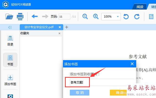 在界面上方的頁碼輸入框中輸入“1”,然后按回車鍵;接著單擊左側的“添加書簽”按鈕,在彈擊的輸入框中輸標簽名稱:目錄
