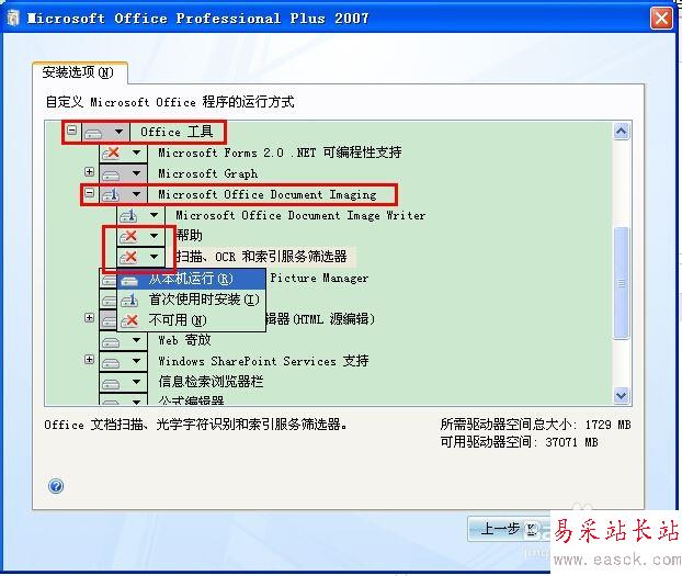 3、再看到窗口里的Office 工具,選擇Microsoft Office Document Imaging,把里面打紅X的點擊一下選擇“從本機運行”,之后就沒紅X了,再點擊繼續: