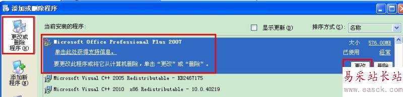 1、同樣剛才的步驟進入到添加和刪除程序里,找到“Microsoft Office Professional Plus 2007”,點擊更改: