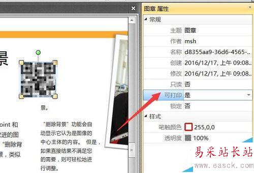 5、待成功創建條形碼后,需要利用“選擇工具”選中該條形碼,在其“屬性”面板中將“可打印”設置為“是”。