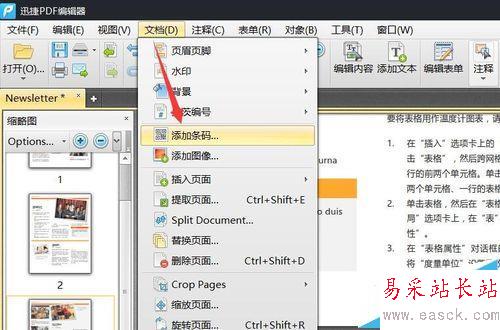 2、當code128字體安裝完成后,就可以嘗試利用相關pdf編輯器查看并打印pdf文檔及其中的條形碼圖案啦。給pdf文檔添加條形碼的方法很簡單,點擊“文檔”-“添加條碼”項。