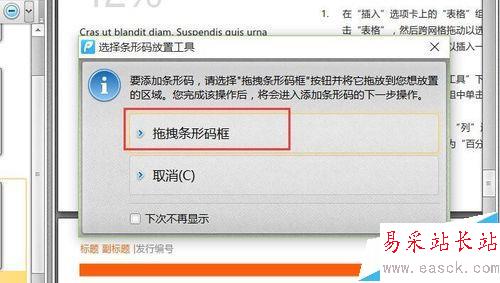 3、從打開的“選擇條形碼放置工具”窗口中,點擊“拖拽條形碼框”選項。此時就可以通過拖拽來創建條形碼區域,如圖所示: