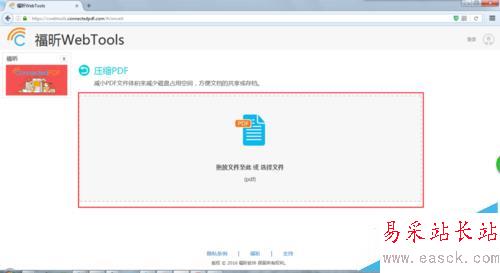4、點擊之后,它會彈出文件選擇框,你可以進行選擇一個你要進行壓縮的PDF文件。 或者你也可以拖拽一個PDF文件進到這個虛線框內,也可以自動上傳。