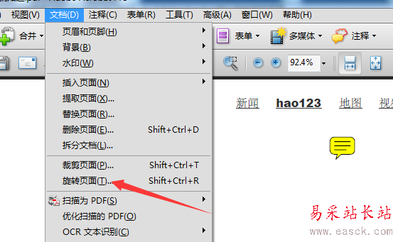 3、點(diǎn)擊了的文檔的菜單之后,彈出了下拉菜單選中為旋轉(zhuǎn)頁面的選項(xiàng)。
