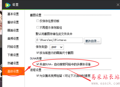 2、在【設置】界面下,點擊【高級設置】-勾選【開啟DLNA,自動搜索網絡中的多媒體設備】-【應用】選項完成設置。