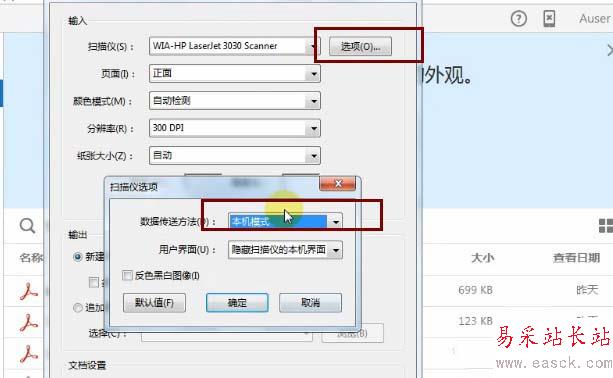 2、接下來彈出的對話框中我們點擊掃描儀后面的選項按鈕,設置掃描儀選項內容,如下圖所示