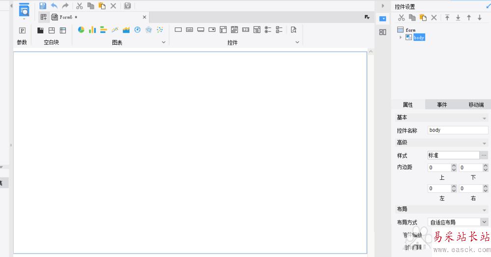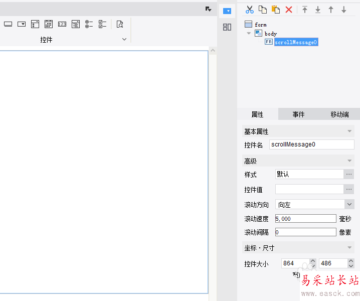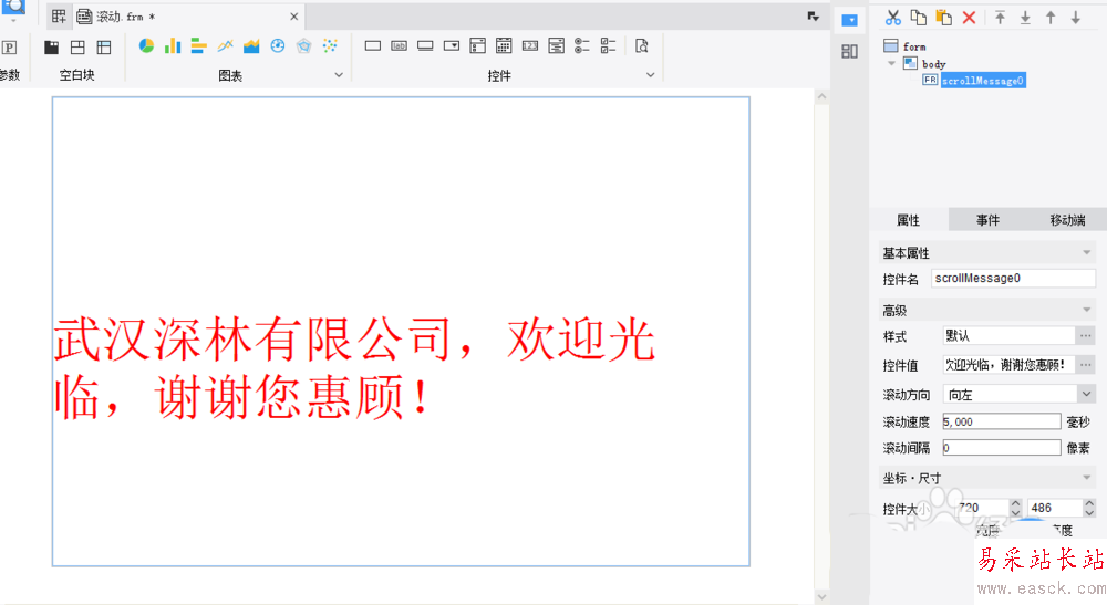 2、在控件欄處找到滾動字幕控件,拖動到決策報表編輯區域,可以發現這個控件放在了body下面,如下圖所示:
