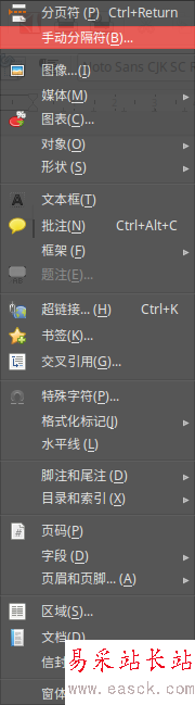 2、打開“插入”菜單,點擊“手動分隔符”。