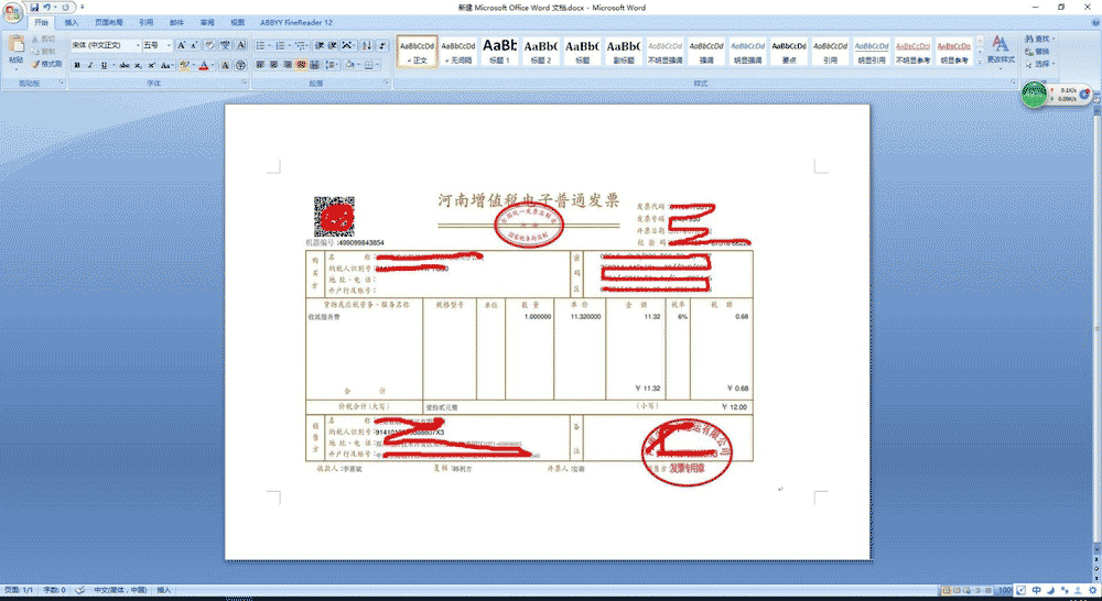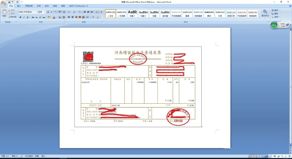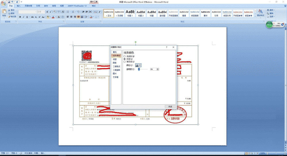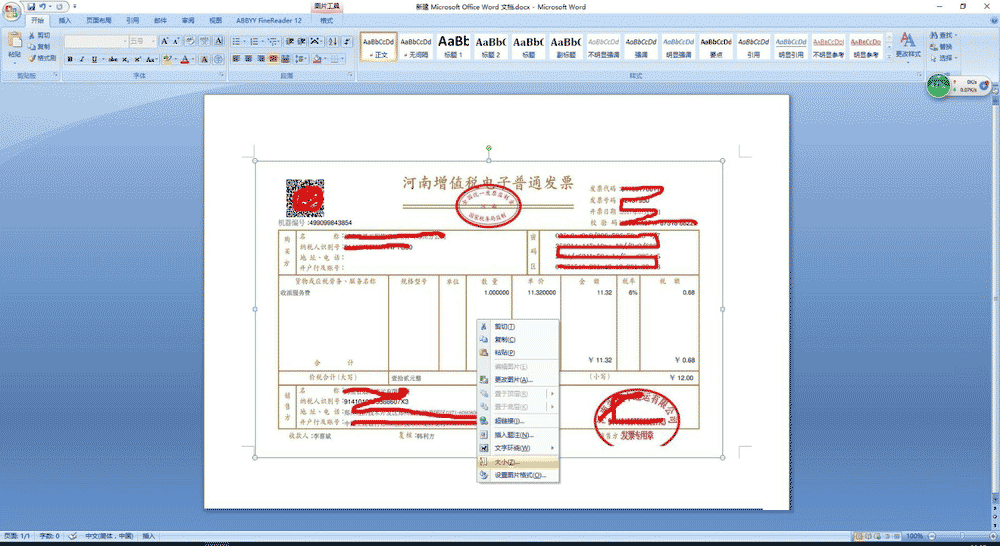 在電腦上新建word文件,把電子發票粘貼進去,調整大小:高度為13.97CM,保持縱橫比不變,設置線條為黑色,打印出來后方便剪裁,打印,完成!