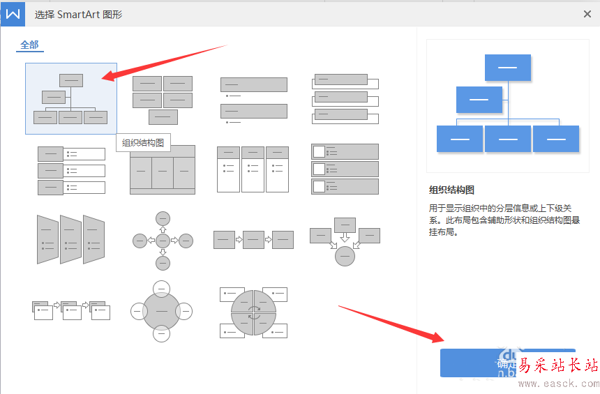 3、在“選擇SmartArt圖形”中選擇組織機構圖,然后點擊確定。