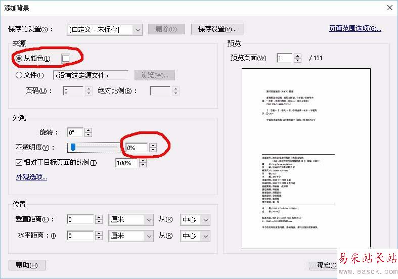 3、來源:“從顏色”默認一般為白色,如果不是白色請選成白色,不透明度改成0%,點確定;