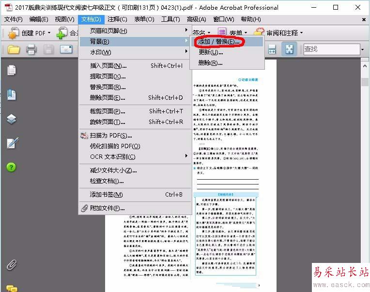 2、在菜單中選擇“文檔-背景-添加/替換”給pdf文件添加背景;