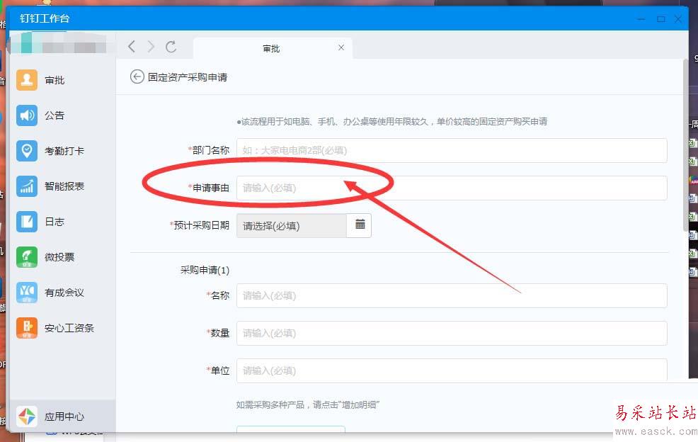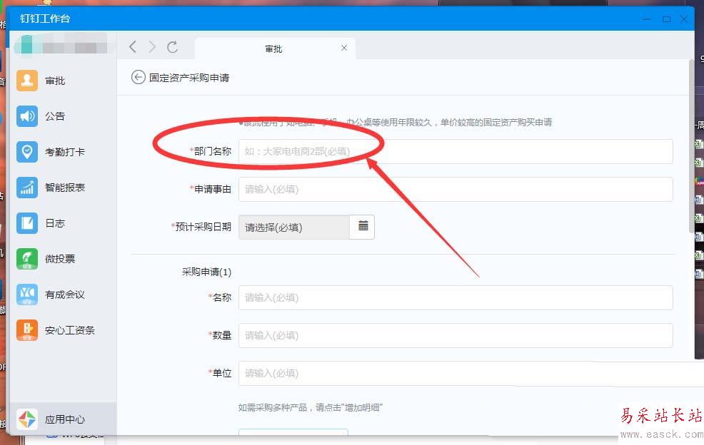 第二步:部門名稱。“部門名稱”即需要進行固定資產采購申請的部門名字;如下圖: