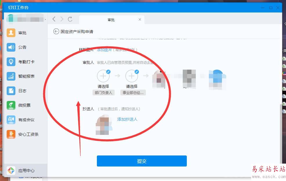 第七步:審批人&抄送人。“審批人&抄送人”即該申請需要審批和抄送的人員;如下圖: