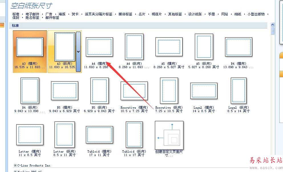 3、根據紙張的大小選擇需要的紙張,這里我們選擇A4紙張的尺寸大小,如圖所示,雙擊A4紙張大小;