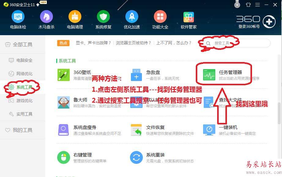 2、進入360工具箱主界面后,通過點左側系統工具或者直接搜索任務管理器,找到任務管理器點擊即可。