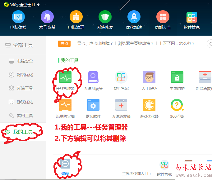 4、360任務(wù)管理器一旦添加就無(wú)需再次添加,可以按照步驟1,在“我的工具”里找到,下次直接在我的工具里使用即可,當(dāng)然也可以通過(guò)編輯將其刪除。