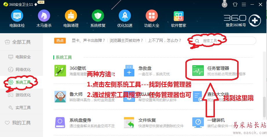 1、進(jìn)入360工具箱主界面后,2種方法找到任務(wù)管理器,找到任務(wù)管理器后,點(diǎn)擊即可