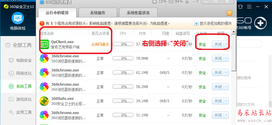 2、單擊任務(wù)管理器后,360會(huì)自動(dòng)添加小程序,在安裝完成后便會(huì)自動(dòng)打開任務(wù)管理器應(yīng)用程序,在里面會(huì)列出當(dāng)前后臺(tái)運(yùn)行程序及占用資源情況,還有在程序右側(cè)管理下方,可選擇關(guān)閉不需要運(yùn)行的程序