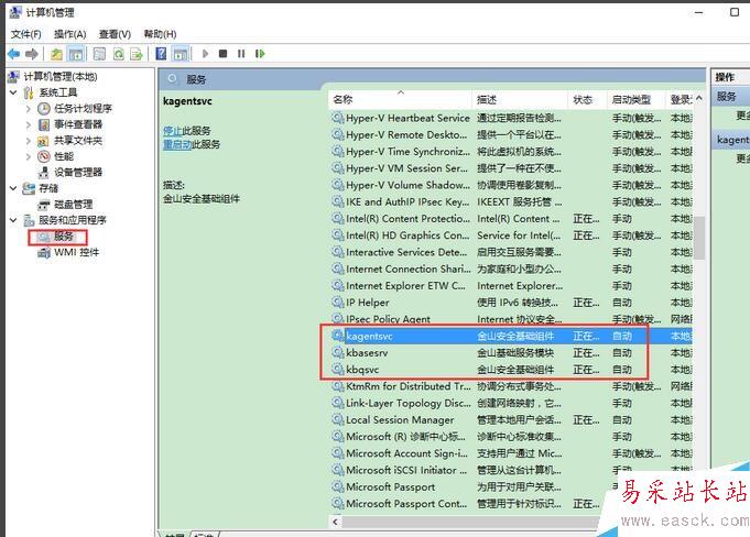 進入計算機管理,左側(cè)導(dǎo)航里面依次點擊“服務(wù)和應(yīng)用程序”-“服務(wù)”,然后右側(cè)找到關(guān)于金山的服務(wù)。描述里面會有表示金山相關(guān)服務(wù),金山的服務(wù)名稱大都是K開頭的。