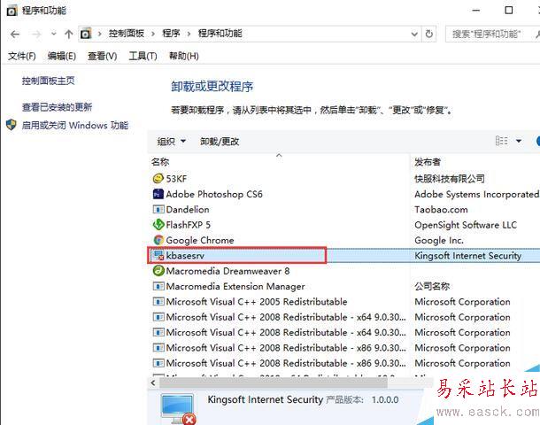 然后找到金山的程序,發(fā)布者為kingsoft或者是金山的,都是金山安裝的程序。比如下面這個kbasesrv的,點擊卸載。另外,金山還有wps,這個如果需要用辦公的,可以留著。如果不需要的, 卸載掉最好。