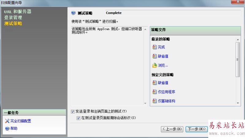 五、點擊”下一步“,出現(xiàn)測試策略的頁面,可以根據(jù)不同的測試需求進行選擇,這里選擇的是”完成(Complete)“,即進行全面的測試,