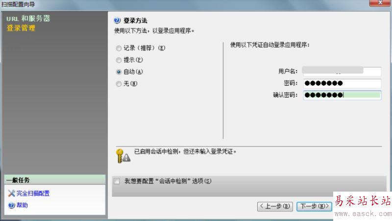 這里選擇使用的登錄方法是自動,即需要輸入用戶名和密碼。如果選擇的是記錄,則需要對登錄過程進行錄入,在錄入的過程中,appscan可以記住一些url,方便進行掃描。