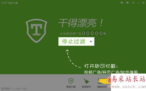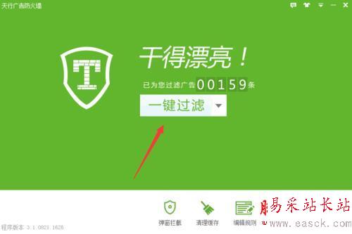 如圖中箭頭所示,點擊主界面中間的“一鍵過濾”按鈕,天行廣告防火墻即可達到最佳效果。(全方位智能廣告攔截)