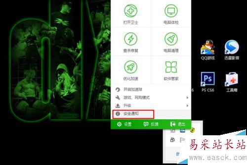 1、在系統(tǒng)托盤區(qū)找到360安全衛(wèi)士的圖標(biāo),用鼠標(biāo)右擊,然后在彈出的菜單中選擇“安全通知”。