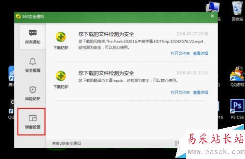 2、在360安全通知窗口中切換到“彈窗管理”。