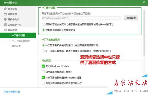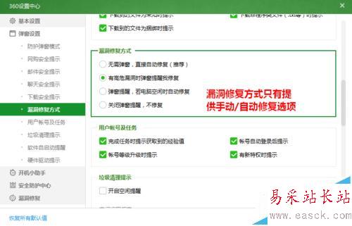 2、在設(shè)置中的“漏洞修復(fù)方式”一項(xiàng)下,我們只能設(shè)置漏洞是否自動(dòng)修復(fù),但并不能禁止安全衛(wèi)士開機(jī)自動(dòng)掃描高危漏洞。