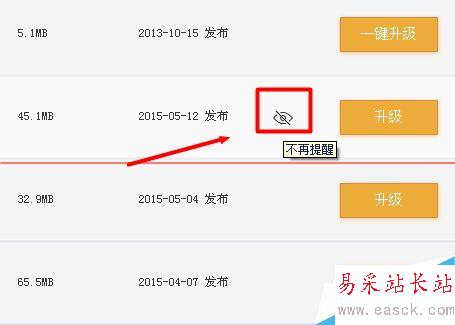 3、如果不想看到某一個軟件的升級提醒,可以將鼠標移動到“升級”圖標的左側(cè)空白處,會自動出現(xiàn)“不再提醒”圖標,點擊之后,該軟件不會在升級提醒中出現(xiàn)。