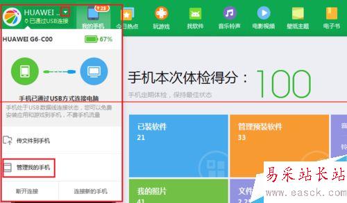 2、在手機助手的左上角可以看到,手機通過USB連接到電腦了,點擊旁邊的小三角,會出現下列菜單,找到“管理我的手機”;