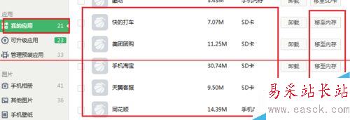 3、接下來會看到手機里所安裝的所用的應用,這里可以隨意的進行軟件搬家,可以將應用搬家至SD卡,也可以移動到手機內存;