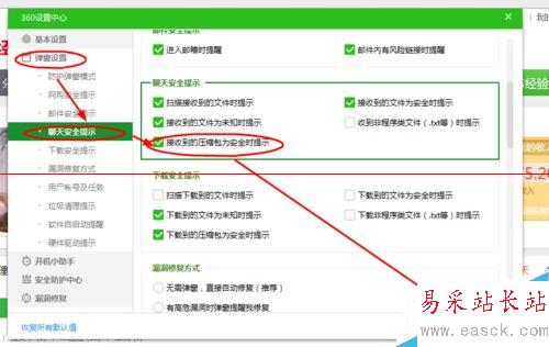 3、在【360設置中心】界面下,點擊選擇【彈窗設置】--【聊天安全提示】--勾選【接收到的壓縮包為安全時提示】--【確定】選項完成設置。(如圖所示)