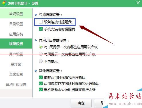 5、在提醒設置里,我們可以看到系統默認的是“設備連接時提醒我”,我們將前面的對勾取消選中即可,至于下面的充滿電要不要提醒,大家可以根據自己的情況決定,筆者建議保留提醒