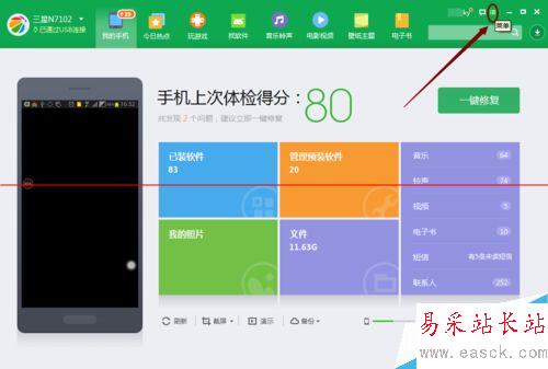 2、通過數據線連接以后,打開電腦端的手機助手首頁,我們可以在右上角找到名為“菜單”的按鈕