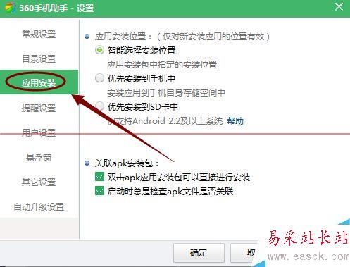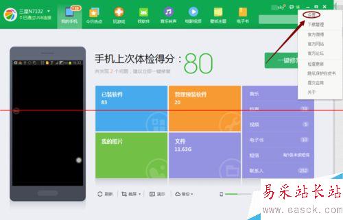 3、然后點擊該項,就會彈出一個下拉窗口,我們選擇其中的第一項“設置”,然后會在首頁彈出“360手機助手-設置”頁面,見下圖