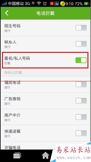 7、這樣一來,一旦對方手機(jī)打過來的電話顯示:隱藏號碼、私人號碼、未知號碼等等都會被自動攔截了!