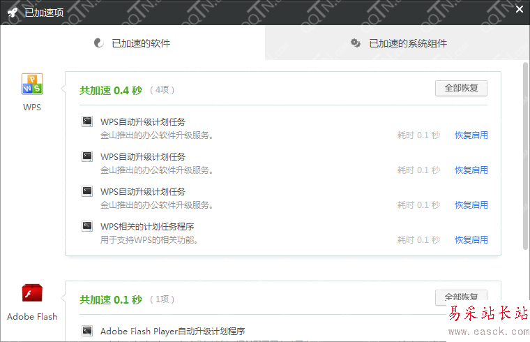 5、同時可以在下載進入已加速項管理,已經加速的軟件和已經加速的系統組件,可以在這恢復啟動