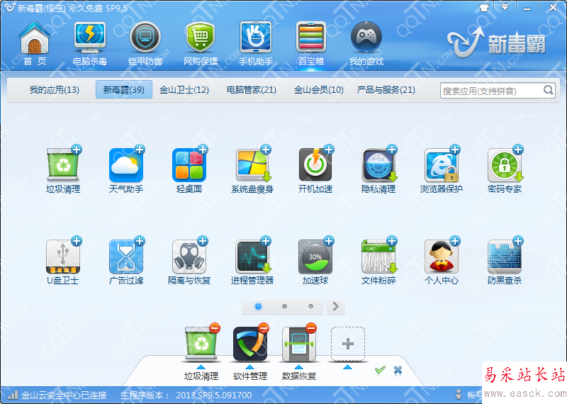 用戶在安裝了新毒霸之后,在軟件界面都找不到開機啟動項設置的地方,軟件主界面只有電腦殺毒、鎧甲防御、網購保鏢、手機助手、百寶箱、我的游戲等幾大功能區域。使用新毒霸如何管理我系統開機啟動項呢?