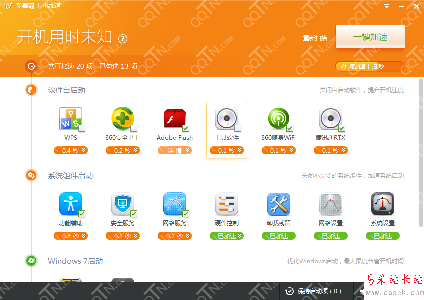 4、同時可以點擊一鍵加速,加速之后,會自動關閉一些無用的啟動項