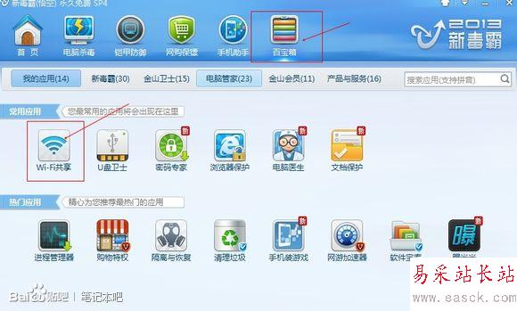 1、安裝最新版金山毒霸軟件,打開下圖所示的百寶箱,在百寶箱里有個Wi-Fi共享的應用,這就是金山毒霸的WiFi共享。
