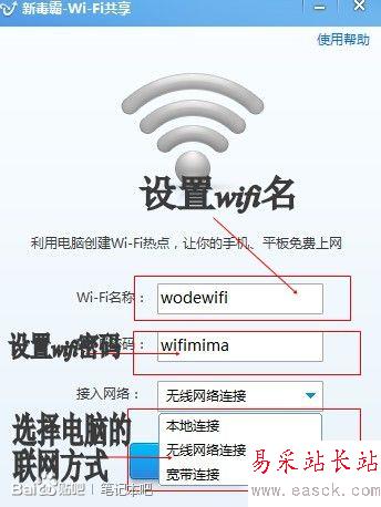 2、打開應用后,如下圖所示:在WiFi名處填寫你要設置WiFi的名字,密碼處填寫你要設置的密碼;最下面是你電腦的聯網方式:如果筆記本連的是寬帶,直接選寬帶就可以;如果筆記本連的是本地連接(如校園網)就選本地連接;如果筆記本連的是無線(如中國電信的WiFi)就選無線連接,然后開啟!【親測好像cmd方法只對寬帶連接有用,這也是這個方法的一大亮點】