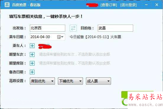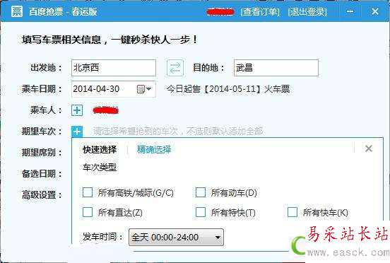打開百度衛士進行搶票了,選好站點和時間掛著就行...